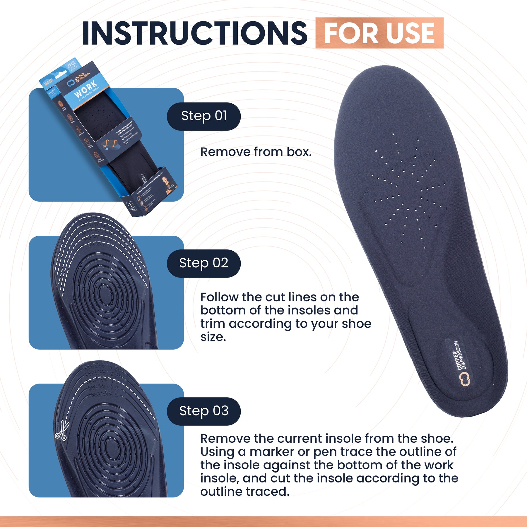 Copper Compression Work All Day Comfort Insoles are made for long days on your feet. This orthopedic style, full length footbed combines responsive cushioning with structured support to help you stay comfortable through shifts, errands, and active days.